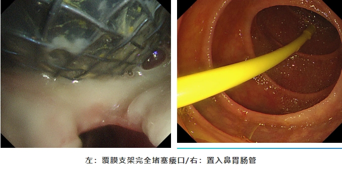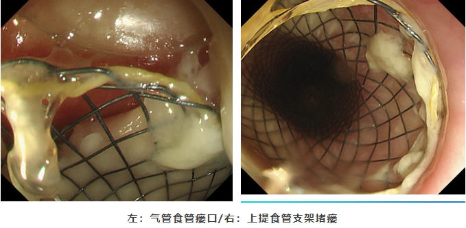 經充分評估病情后,消化內科主任張排旗在氣管插管全麻下行胃鏡檢查,發現瘺口距門齒約20cm,在內鏡引導下鉗夾支架上口上移2cm。同時,戚剛強行氣管鏡下檢查,瘺口已完全被食管覆膜支架覆蓋,隨后順利置入鼻胃腸管,為后續氣管支架置入術創造了條件。治療過程順利,患者生命體征平穩,麻醉蘇醒后安返病房。