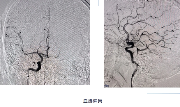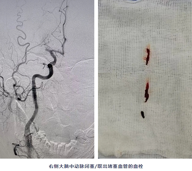 患者入院后,急診檢查初步判斷腦卒中,卒中綠色通道立即開通,完善頭顱CT排除腦出血,考慮缺血性腦卒中。腦科病院王建強院長團隊立即給予靜脈溶栓,但癥狀無明顯緩解,核磁評估腦血管,提示右側大腦中動脈閉塞。醫護團隊與患者家屬充分溝通并取得同意后,立即聯系介入手術室,行大腦中動脈閉塞血管再通術,成功開通責任血管,從穿刺到取出血栓,僅用時8分鐘。