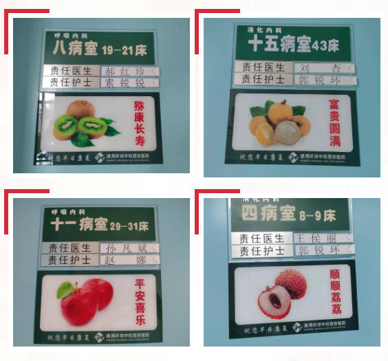 平安喜樂、獼康長壽、順順荔荔、福壽康檸……為進一步營造溫馨、舒適的住院環境,近日,醫護人員在各病室門上張貼了水果標識牌,這種代表水果名稱的祝福語,設計新穎易識別,在幫助病房患者及家屬輕松找到房間的同時,也把貼心和溫暖送到每個人身邊。